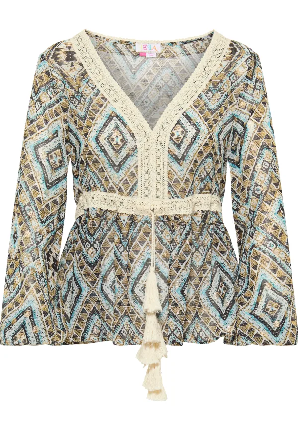 Geen voering/geen voering, geen vulling Met de tuniek van IZIA kun je heerlijk chillen aan de strandbar of neem je het model met de trendy etnische print mee door het mediterrane nachtleven. Het design is gemaakt van lichtgewicht materiaal en afgewerkt met goud metallic dots. De kanten bies aan de V-hals en taille en de kwastdetails aan het koord sieren het all-over bedrukte model, waarvan het silhouet naar wens kan worden geaccentueerd met het taillekoord. Tuniek lange mouwen