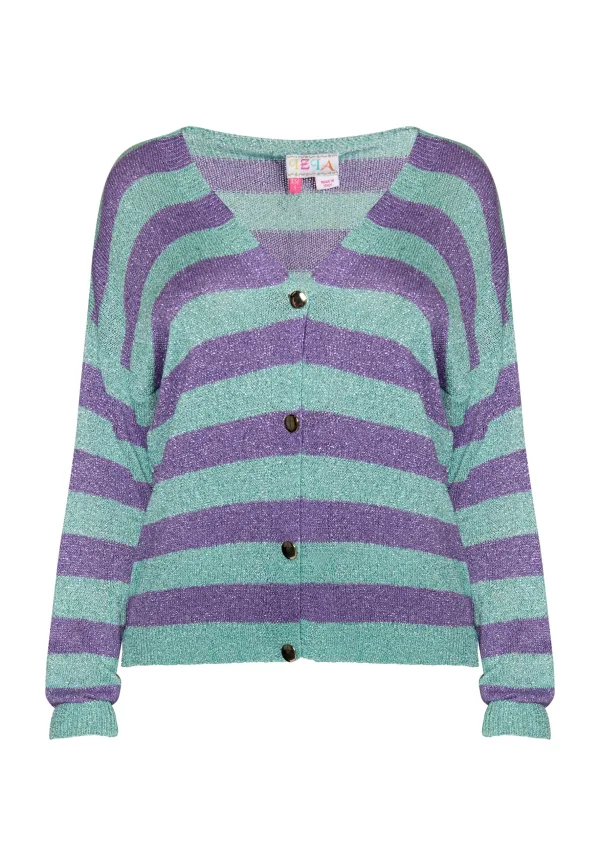 Glinsterende tinten en glanzende metallic nuances zijn ook een groot thema bij IZIA. Het casual vest van zacht viscosegaren heeft een gestreept dessin, is recht gesneden en heeft geribde manchetten. Vier knopen sieren het model, dat is gebreid met metallic garen en perfect te combineren is met denim. Jumper