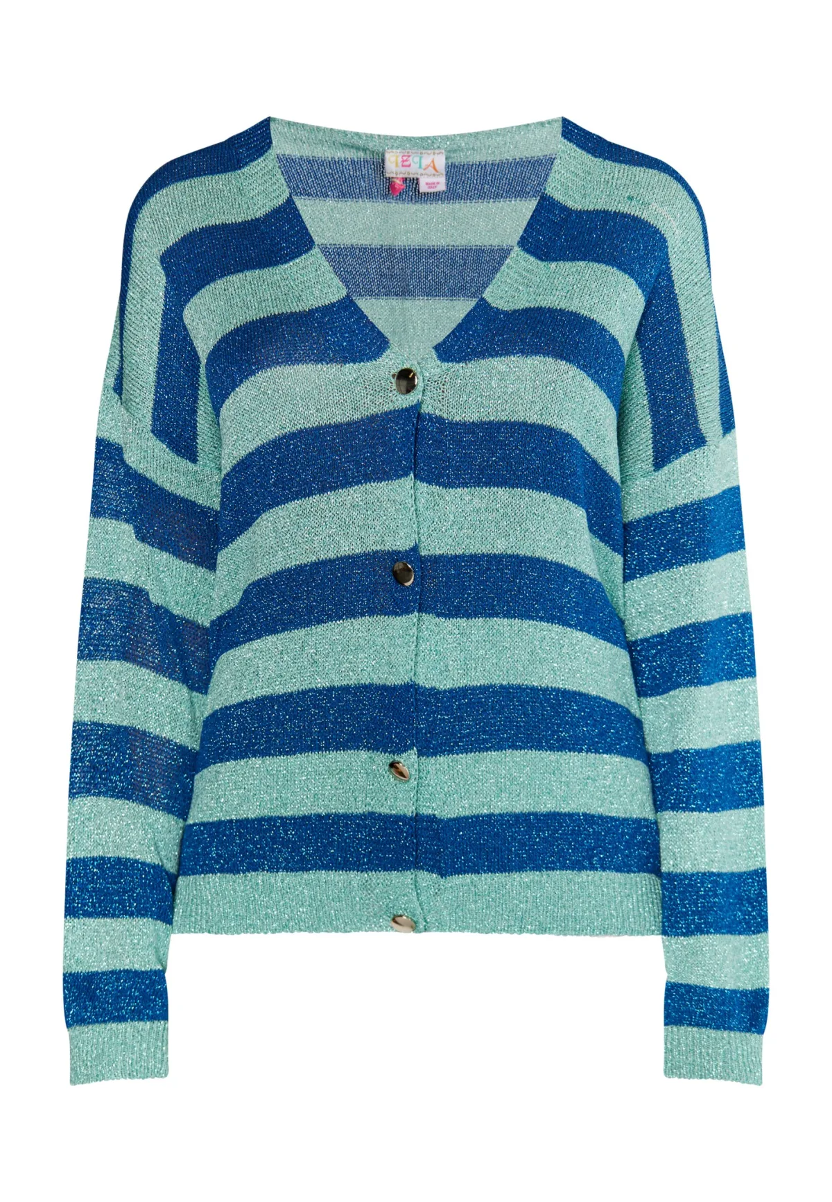 Glinsterende tinten en glanzende metallic nuances zijn ook een groot thema bij IZIA. Het casual vest van zacht viscosegaren heeft een gestreept dessin, is recht gesneden en heeft geribde manchetten. Vier knopen sieren het model, dat is gebreid met metallic garen en perfect te combineren is met denim. Jumper