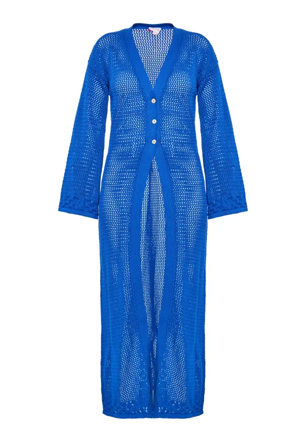 Dit voortreffelijke vest met lange mouwen heeft een gebreide textuur die over het hele oppervlak een ingewikkeld, opengewerkt patroon creëert. Met een flatterende V-hals en een knoopsluiting aan de voorkant die in het midden loopt. Rechte mouwen, versierd met een delicaat gekarteld breipatroon aan de onderkant, geven dit zomermodel elegantie. Dit vest is perfect om over elke outfit te dragen en is subtiel transparant voor een luchtige look. Vest