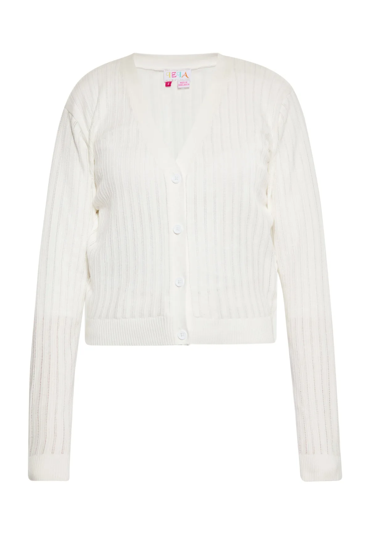 Maak kennis met een stijlvol gebreid vest met een V-hals en knoopsluiting aan de voorkant. De geribbelde textuur en verticale patronen creëren diepte in het ontwerp, aangevuld met lange mouwen en geribde zoom en manchetten. Dit lichtgewicht zomervest met knoopsluiting is perfect voor de zomer Vest