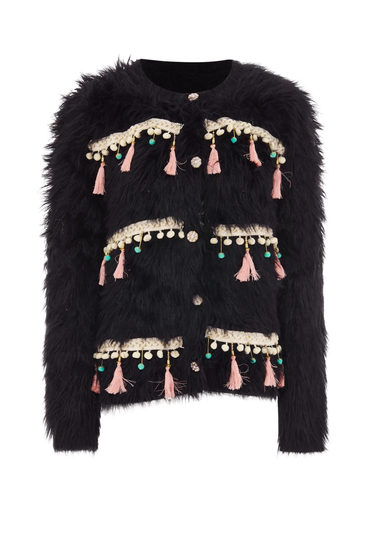 Deze gestructureerde trui is vervaardigd met nauwgezette aandacht voor detail en straalt elegantie en verfijning uit. Versierd met sierlijke kralen, kwastjes en glinsterende versieringen in betoverende horizontale patronen over de buste en taille, en voorzien van een luxueus franje-effect. De donzige, ruige textuur geeft het een zachte en pluizige uitstraling, terwijl de symmetrische plaatsing van de versieringen het sierlijke ontwerp versterkt.