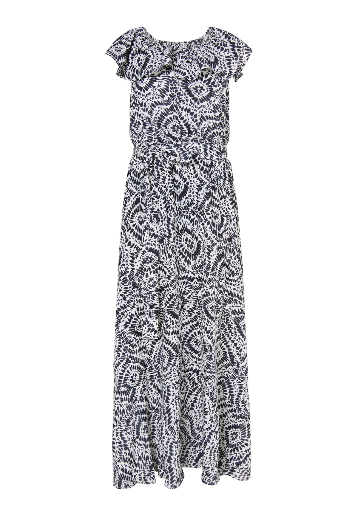 Design: Gevoerde zoom/rand; Halstype: Carmen hals; Soort bandjes: Normale bandjes; Details: Volant, Gedrapeerd; Extra's: All-over patroon; Lengte: Lang/maxi; Pasvorm: Normale pasvorm; Armlengte: Kwartmouw