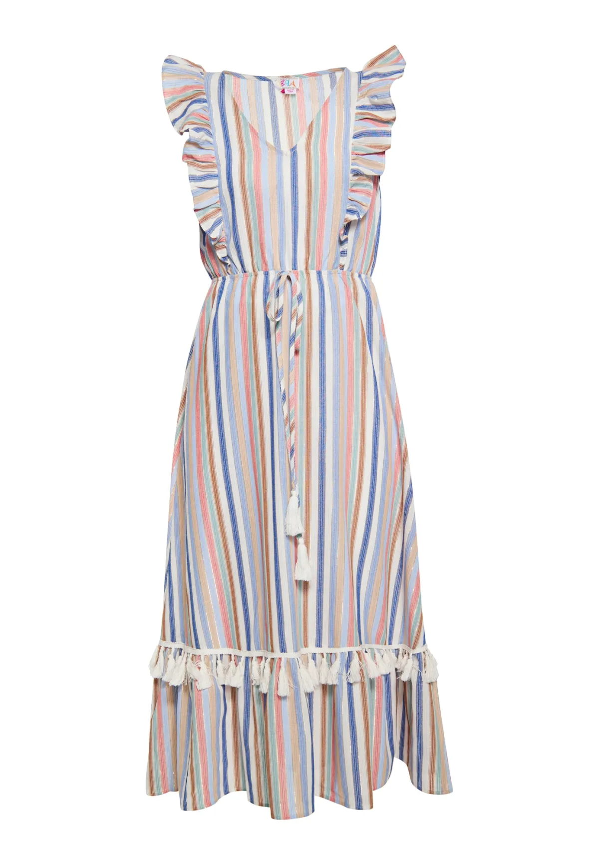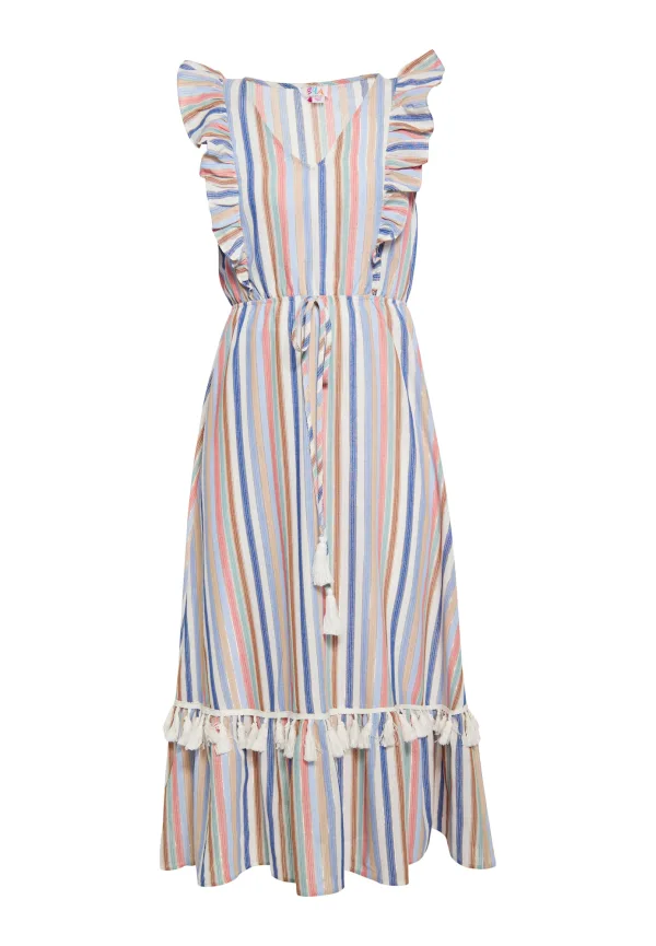 Deze midi-jurk is een levendige en stijlvolle toevoeging aan je garderobe en heeft kleurrijke strepen die een leuke zomerse look uitstralen. Een V-halslijn en korte mouwen met ruches dragen bij aan de etnisch geïnspireerde charme, terwijl een gestrikte taille met een koord afgewerkt met kwastjes zorgt voor een pasvorm op maat. De uitlopende jurk sluit sierlijk aan op het silhouet, terwijl een mooie ruches aan de zoom een chique en casual touch toevoegen. Deze jurk is perfect voor casual gelegenheden en ontworpen met comfort en stijl in gedachten. Jurk