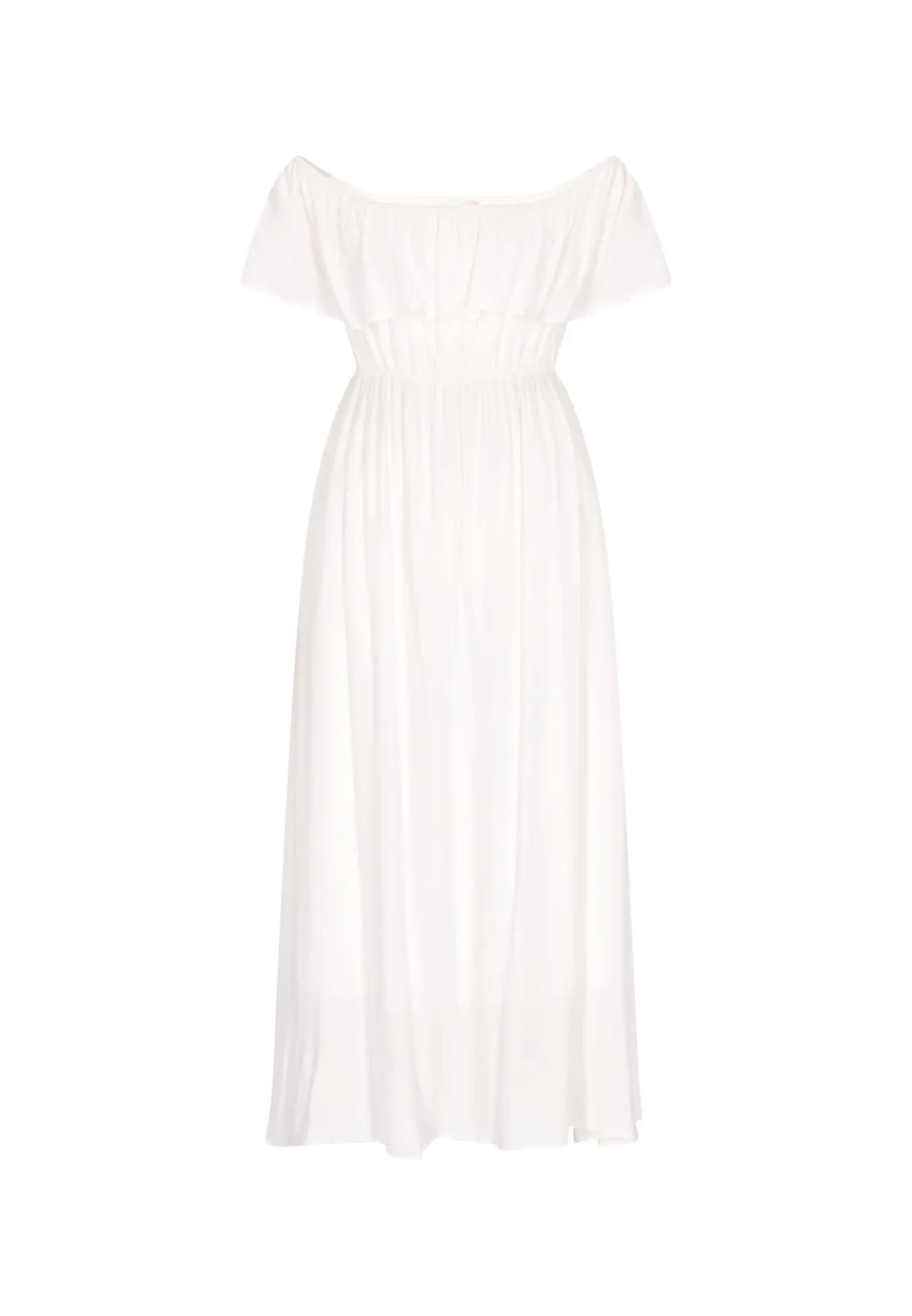 Design: Strapless/off-shoulder; Type sluiting: Slip; Materiaal: Viscose; Halstype: Carmen hals; Motief: Effen; Details: Volant, Gedrapeerd; Extra's: Op staal naden; Lengte: 7/8 lengte; Snit: Getailleerd; Pasvorm: Normale pasvorm; Armlengte: Kwartmouw