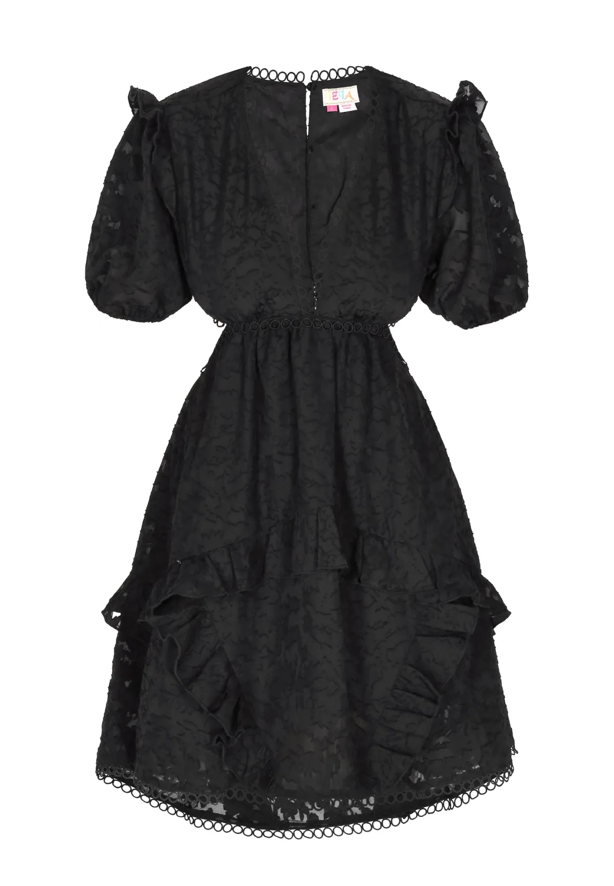 Design: Pofmouwen; Type sluiting: Knoopsluiting; Materiaal: Chiffon; Halstype: V-hals; Motief: Effen; Details: Ruches, Volant, Gedrapeerd, Backless; Extra’s: Op staal naden; Lengte: Kort/mini; Snit: Getailleerd; Pasvorm: Normale pasvorm; Armlengte: Kwartmouw