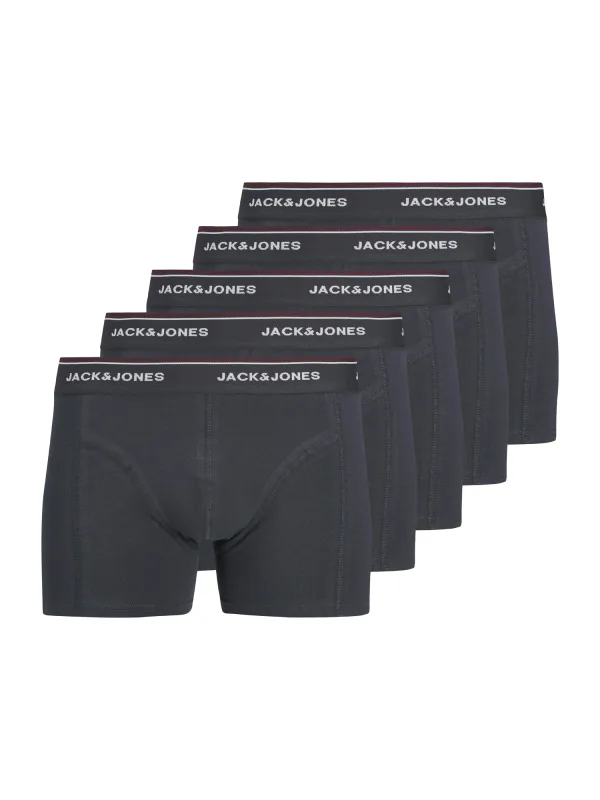 De Jack & Jones JACAVERY 5-pack trunks voor heren biedt een comfortabele en aansluitende pasvorm in een set effen grijze boxershorts. Dankzij de combinatie van biologisch katoen en elastaan voelen ze zacht aan en blijven ze de hele dag goed zitten.