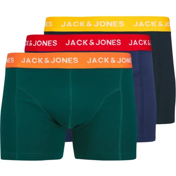 Jack & Jones boxershorts voor heren. De set onderbroeken bevat 3 effen onderbroeken in het donkergroen, donkerblauw en zwart met elastische waistbands en korte pijp. Daarnaast is de elastische waistband voorzien van het Jack & Jones logo en kleuraccent. De gebreide Jersey stof is lichtgewicht en stretchy voor extra comfort. Gemaakt van 95% katoen en 5% elastaan.