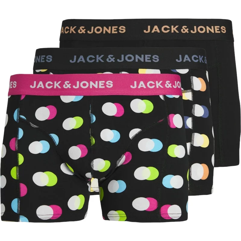 Jack & Jones boxershorts voor heren. De set onderbroeken bevat 3 onderbroeken waarvan één in effen zwart, en twee met gekleurde stippen. Met elastische waistband en korte pijp. Daarnaast is de waistband voorzien van het Jack & Jones logo. De gebreide Jersey stof is lichtgewicht en stretchy voor extra comfort. Gemaakt van 95% katoen en 5% elastaan.