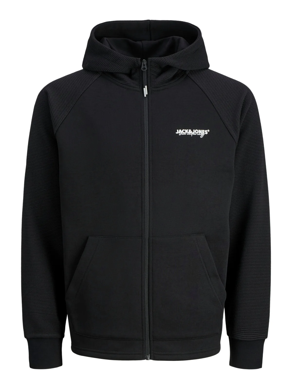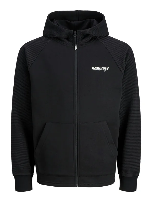 Sweatjack voor heren van Jack & Jones;Elastische materiaalmix;Regular fit;Model 'Thatcher';Opstaande kraag;Logoprint;Structuurpatroon;Standaardritssluiting;Gedeelde kangoeroezak;Elastische mouwboorden;Ruglengte bij maat M: 66 cm;Mouwlengte bij maat M: 73 cm