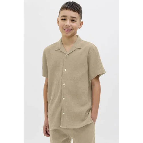 Dit JACK & JONES JUNIOR overhemd voor jongens is gemaakt van 100% katoen. Het heeft een crinkle cotton look en korte mouwen. De klassieke kraag geeft het beige overhemd een tijdloze uitstraling.