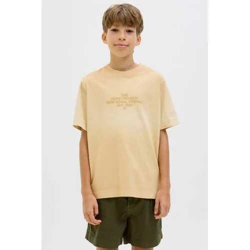 Dit JACK & JONES JUNIOR T-shirt heeft een relaxed pasvorm en korte mouwen. Het beige ontwerp is gemaakt van 100% katoen en heeft een ronde hals. Perfect voor een informele en comfortabele look.
