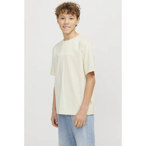 Dit JACK & JONES JUNIOR T-shirt voor jongens is in de stijlnaam JORFREDERIKSBERG en komt in een offwhite kleur. Gemaakt van 100% katoen, heeft een ronde hals en korte mouwen. Perfect voor dagelijks comfort en stijl.