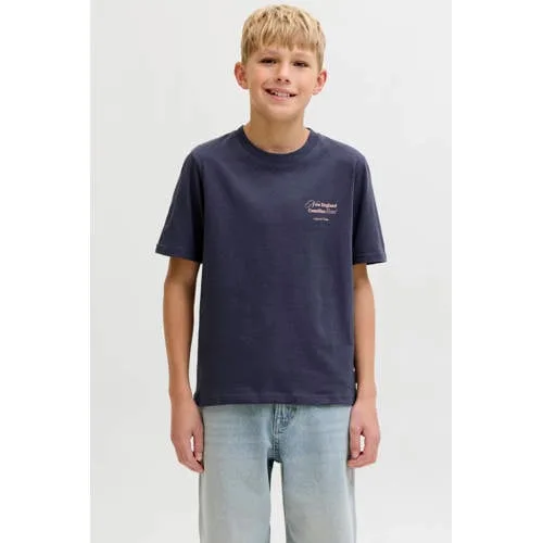 Voor iedere dag op school of in het weekend is dit JACK & JONES jongens T-shirt een handige basis met een rustige uitstraling en een grafische backprint. Het JORMONTAUK shirt in grijsblauw heeft een rustige voorkant en een opvallende print op de rug, waardoor het wat meer karakter krijgt zonder druk te ogen. Gemaakt van 100% katoen, voelt het materiaal zacht en luchtig aan op de huid.Details die het verschil maken Gemaakt van 100% katoen voor een zachte, ademende touch Grijsblauwe kleur die makkelijk combineert met jeans, joggers of korte broek Korte mouwen en ronde hals voor een ontspannen, alledaagse fit Backprint aan de achterkant als opvallend detail Geschikt voor schoolkind en tiener, uit de Daily collectie Valt normaal volgens het maatadvies Wasbaar op 40 graden en warm strijkbaar, niet geschikt voor de droogtrommelVoor elke dag in de weekDit T-shirt past goed bij de dagelijkse garderobe van je kind. Draag het met een spijkerbroek en sneakers voor school of combineer het met een joggingbroek voor een relaxte dag thuis. De grijsblauwe tint is makkelijk te combineren met verschillende kleuren en prints.JACK & JONES JUNIOR voor moderne kidsJACK & JONES JUNIOR vertaalt de bekende stijl van JACK & JONES naar kleding voor jongens. De collectie draait om comfortabele fits, actuele kleuren en prints die aansluiten bij wat kinderen graag dragen. Zo krijgt je kind dezelfde stijl als de volwassen collectie, met materialen en pasvormen die zijn afgestemd op dagelijks draagplezier.Een T-shirt met backprint dat geschikt is voor iedere dag.