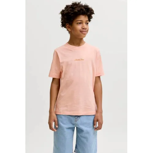 Voor elke dag van de week is dit lichtoranje jongens T-shirt van katoen een praktische basis. De frisse kleur valt op zonder te schreeuwen en past makkelijk bij jeans, joggers of een korte broek. De ronde hals en korte mouwen maken het shirt geschikt voor school, vrije tijd en alles daartussenin. Gemaakt van 100% katoen voelt het materiaal zacht aan op de huid.Comfortabel T-shirt met stoere backprint Lichtoranje kleur die goed combineert met denim en neutrale tinten 100% katoen, voor een zachte touch en prettig draagcomfort Korte mouwen en ronde hals, ideaal als basislaag of los T-shirt Backprint op de rug voor een subtiele, stoere look Geschikt voor schoolkind en tiener, uit de Daily collectie Maatadvies: dit artikel valt normaal Onderhoud: handwas, niet strijken en niet in de droogtrommel drogenGeschikt voor drukke dagenDit T-shirt is gemaakt voor dagen vol beweging. Of het nu gaat om een schooldag, buitenspelen of chillen met vrienden, het shirt blijft comfortabel zitten. De backprint geeft net dat beetje extra aan een simpele outfit.JACK & JONES JUNIOR stijlJACK & JONES JUNIOR vertaalt de bekende JACK & JONES look naar kleding voor jongens. De collectie sluit aan bij wat oudere jongens leuk vinden om te dragen en biedt herkenbare styles in kindermaten, met aandacht voor pasvorm en draaggemak.Een veelzijdig T-shirt dat geschikt is voor elke dag.