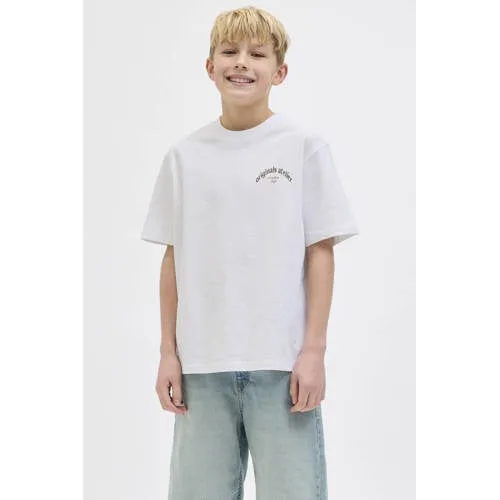 Dit JACK & JONES JUNIOR T-shirt voor jongens heeft een losse pasvorm. Gemaakt van 100% katoen in het wit. De ronde hals en korte mouwen zorgen voor een comfortabele en casual look. Perfect voor elke dag.
