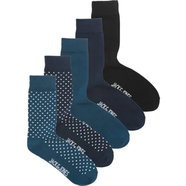 Multipack van 5 paar Jack and Jones heren sokken. Bundel bevat zwarte en navy blauwe sokken met stippen print. Deze sokken hebben een optimale pasvorm bij schoenmaat 42-44. Gemaakt van 72% katoen, 26% polyester, 2% elastaan.