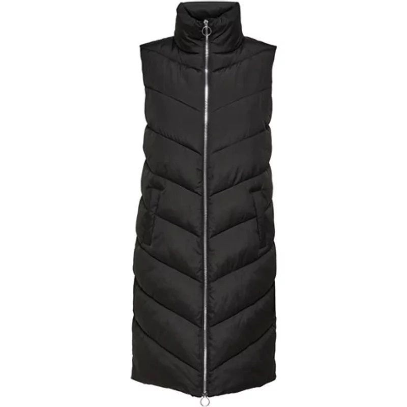 Lange gewatteerde winter bodywarmer van JDY met een highneckkraag. Dit mouwloze model sluit met een rits.Extra details highneckkraag Mouwloos Sluit met rits 2 Steekzakken op de voorpand Materiaal:100% Polyester Wasvoorschrift:Machinewas max. Fijnwas 30 graden Celsius. Niet in droger