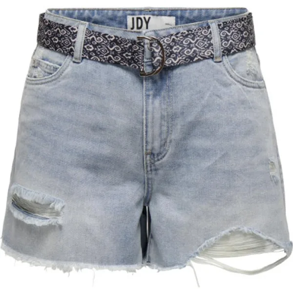 De korte broek van JDY is een 5pocket model en is voorzien van een tailleboord met riemlussen, een knoopsluiting van voren, twee zakken aan de voorkant met een muntenzakje en twee zakken aan de achterkant. Verfraaid met een riem en destroy vlakken Extra details zijn: Regular waist Versleten zoom aan de onderkant Voor en achterzakkenMateriaal:98% Katoen, 2% ElstaanWasvoorschrift:Machinewas max. Fijnwas 30 graden Celsius. Niet in droger
