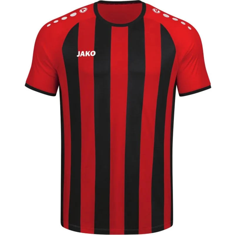 JAKO Shirt Inter korte mouw - 4215 Met verticaal gestreepte banen en verkrijgbaar in 10 verschillende kleuren is dit een shirt waarmee je er staat! Gemaakt van 100% gerecycled polyester en een rug in één kleur en uitgevoerd in Micro-Mesh, waardoor dit shirt ideaal is om te bedrukken. Mesh is een licht geweven stof met een gaasachtige look. De stof is ooit ontworpen door iemand die op zoek was naar een product dat ademend en bestand is tegen extreme temperatuurveranderingen. Met weefgetouwen produceerde hij de stof zo dat er open ruimtes tussen de garens ontstonden. Goed te combineren met het short Allround (4499) en de kousen Alround (3899). Materiaal: 100% polyester-Interlock (gerecycled) Rug van Micro Mesh Volwassen: S t/m XXL Kinderen: 128 t/m 164