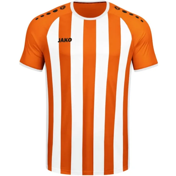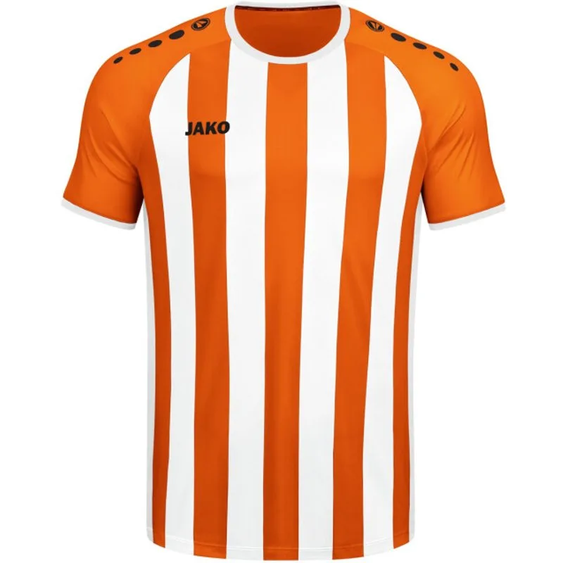 JAKO Shirt Inter korte mouw - 4215 Met verticaal gestreepte banen en verkrijgbaar in 10 verschillende kleuren is dit een shirt waarmee je er staat! Gemaakt van 100% gerecycled polyester en een rug in één kleur en uitgevoerd in Micro-Mesh, waardoor dit shirt ideaal is om te bedrukken. Mesh is een licht geweven stof met een gaasachtige look. De stof is ooit ontworpen door iemand die op zoek was naar een product dat ademend en bestand is tegen extreme temperatuurveranderingen. Met weefgetouwen produceerde hij de stof zo dat er open ruimtes tussen de garens ontstonden. Goed te combineren met het short Allround (4499) en de kousen Alround (3899). Materiaal: 100% polyester-Interlock (gerecycled) Rug van Micro Mesh Volwassen: S t/m XXL Kinderen: 128 t/m 164