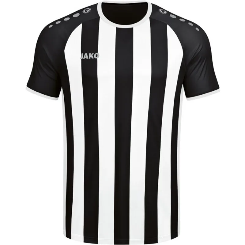 JAKO Shirt Inter korte mouw - 4215 Met verticaal gestreepte banen en verkrijgbaar in 10 verschillende kleuren is dit een shirt waarmee je er staat! Gemaakt van 100% gerecycled polyester en een rug in één kleur en uitgevoerd in Micro-Mesh, waardoor dit shirt ideaal is om te bedrukken. Mesh is een licht geweven stof met een gaasachtige look. De stof is ooit ontworpen door iemand die op zoek was naar een product dat ademend en bestand is tegen extreme temperatuurveranderingen. Met weefgetouwen produceerde hij de stof zo dat er open ruimtes tussen de garens ontstonden. Goed te combineren met het short Allround (4499) en de kousen Alround (3899). Materiaal: 100% polyester-Interlock (gerecycled) Rug van Micro Mesh Volwassen: S t/m XXL Kinderen: 128 t/m 164