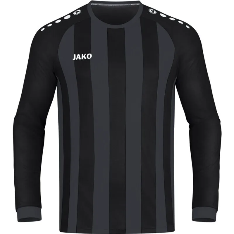 JAKO Shirt Inter lange mouw - 4315 Met verticaal gestreepte banen en verkrijgbaar in 10 verschillende kleuren is dit een shirt waarmee je er staat! Gemaakt van 100% gerecycled polyester en een rug in één kleur en uitgevoerd in Micro-Mesh, waardoor dit shirt ideaal is om te bedrukken. Mesh is een licht geweven stof met een gaasachtige look. De stof is ooit ontworpen door iemand die op zoek was naar een product dat ademend en bestand is tegen extreme temperatuurveranderingen. Met weefgetouwen produceerde hij de stof zo dat er open ruimtes tussen de garens ontstonden. Goed te combineren met het short Allround (4499) en de kousen Alround (3899). Materiaal: 100% polyester-Interlock (gerecycled) Rug van Micro Mesh Volwassen: S t/m XXL Kinderen: 128 t/m 164