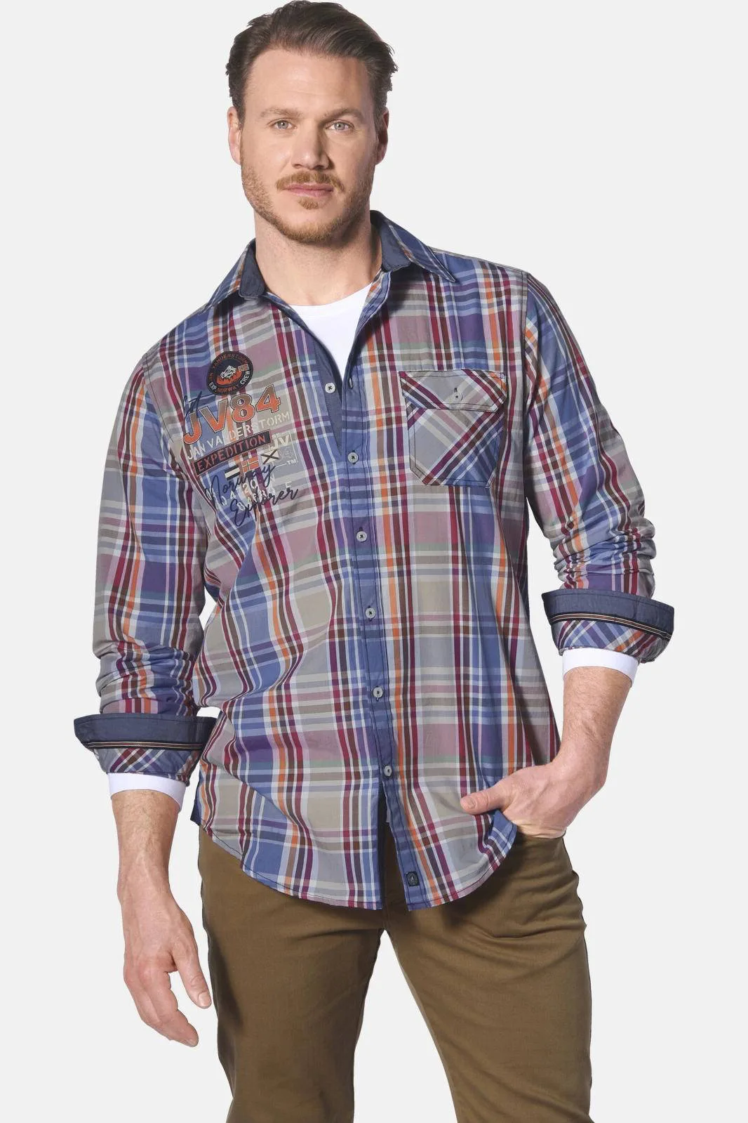 JAN VANDERSTORM is uw expert voor herenmode in grote maten. Het overhemd DETRIK van JAN VANDERSTORM is echt een aanwinst voor iedereen die graag vlotte kleding draagt, maar er toch ook chic uit wil zien. Met de klassieke kentkraag zit u sowieso goed – die ziet er altijd fantastisch uit. Het ruitmotief oogt even fris als verzorgd – perfect voor iedere vrijetijdslook. Praktisch is ook de borstzak links met knoop. Zo raakt u niks kwijt. Maar wat het overhemd echt bijzonder maakt, zijn de coole print en de patch aan de linkerkant – gave blikvangers! En de contrasten? Die zijn de perfecte finishing touch. Kortom: het overhemd DETRIK staat garant voor een fantastische look. Materiaal: 100% katoen. Geschikt voor de wasmachine. Collectie +Fit: comfortabel model uit onze +Fit-collectie. Met ons speciale model +Comfort is dit bovenstuk langer aan de voorkant zodat het in de broek gedragen kan worden zonder dat het uit de broeksband glipt, ook bij een duidelijk buikje.