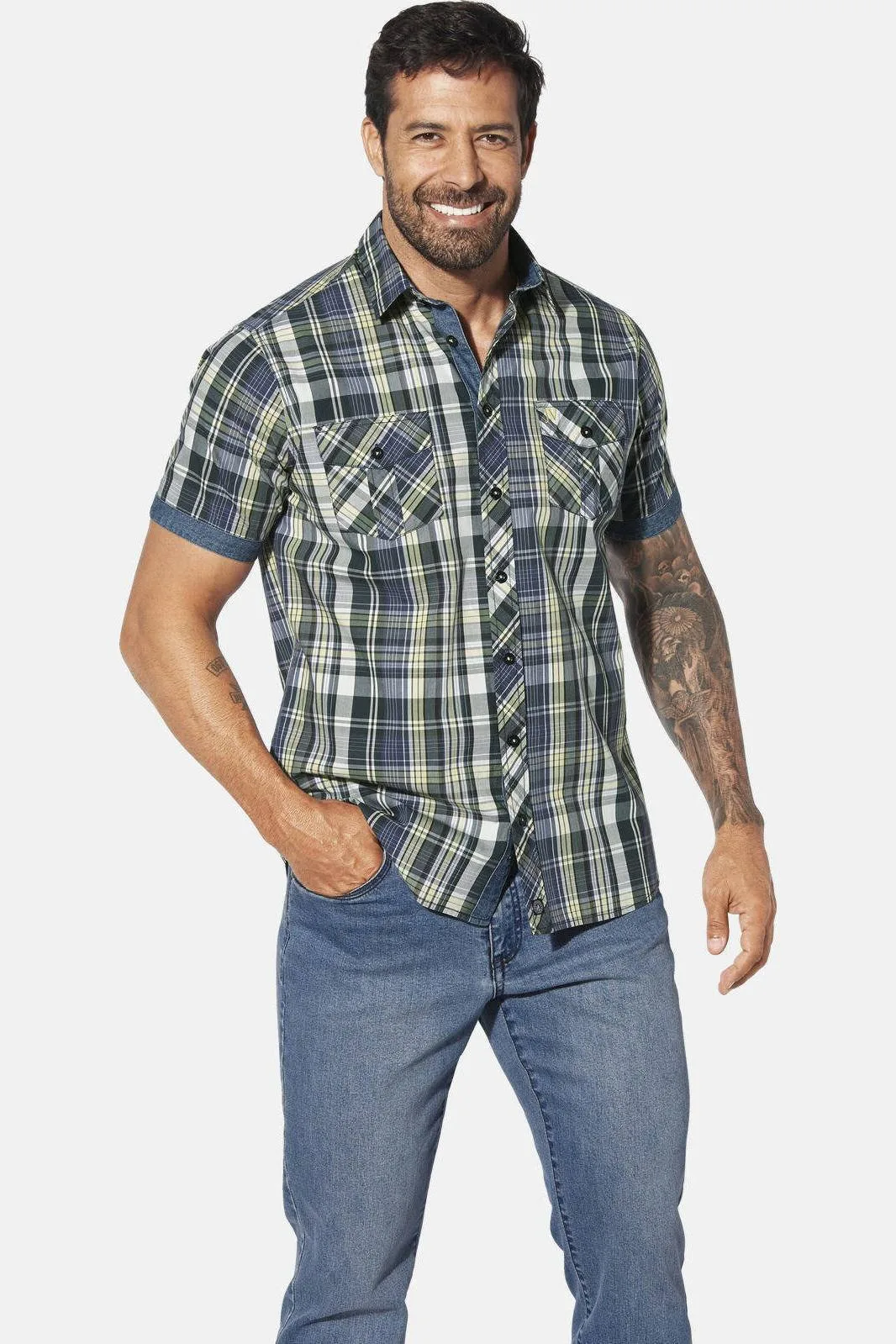JAN VANDERSTORM is uw expert voor herenmode in grote maten. Dompel jezelf onder in de wereld van casual mode met het RUNKAR overhemd met korte mouwen van JAN VANDERSTORM - ideaal voor mannen die van een relaxte en opvallende stijl houden. Dit overhemd maakt indruk met zijn expressieve ruitpatroon dat nonchalance uitstraalt. De opgestikte klepzakken op de borst met borduursel en knopen voegen een vleugje karakter toe, terwijl de mouwboorden in denimlook moderne accenten toevoegen. De nette Kent-kraag rondt de algehele look af in een ontspannen, luchtige stijl. Het RUNKAR overhemd met korte mouwen is perfect voor iedereen die van pittige mode houdt.