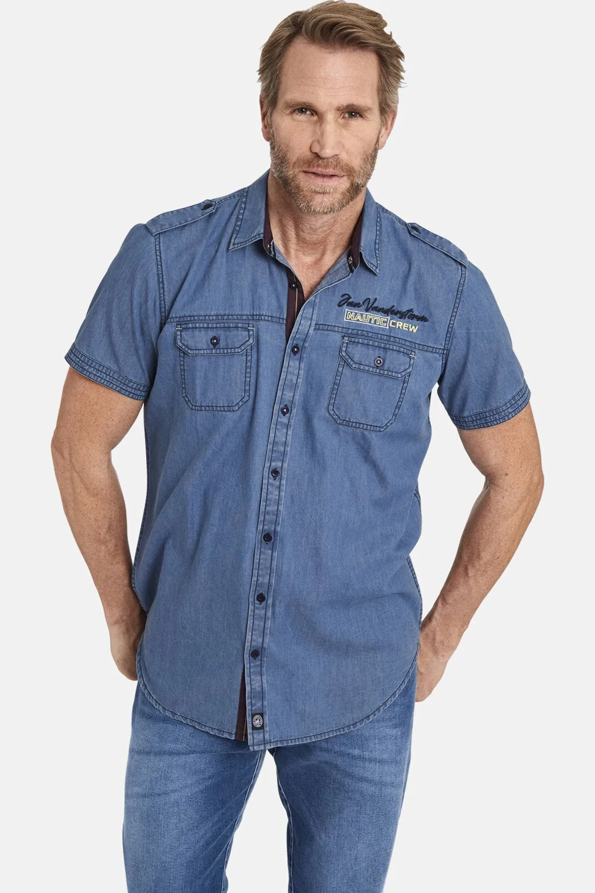 JAN VANDERSTORM is uw expert voor herenmode in grote maten.Bij het overhemd met korte mouwen LORENSIUS springen de epauletten met knoop en de opgestikte borstzakken – eveneens met knoop – meteen in het oog. Bij een tweede blik worden er contrasterende details zichtbaar, zoals de binnenkant van de kentkraag, het garneersel met kettingnaad in het midden, de knopen met JAN VANDERSTORM-gravure en de viervoudig gestikte mouwzomen. De bewegingsplooi op de rug zorgt er trouwens voor dat LORENSIUS altijd heerlijk zit. De geborduurde teksten links op de borst maken bovendien duidelijk dat u zich lid van de 'Nautic Crew' van JAN VANDERSTORM voelt. Bijpassende chino's en korte broeken vindt u in onze collectie. 100% katoen. Geschikt voor de wasmachine.