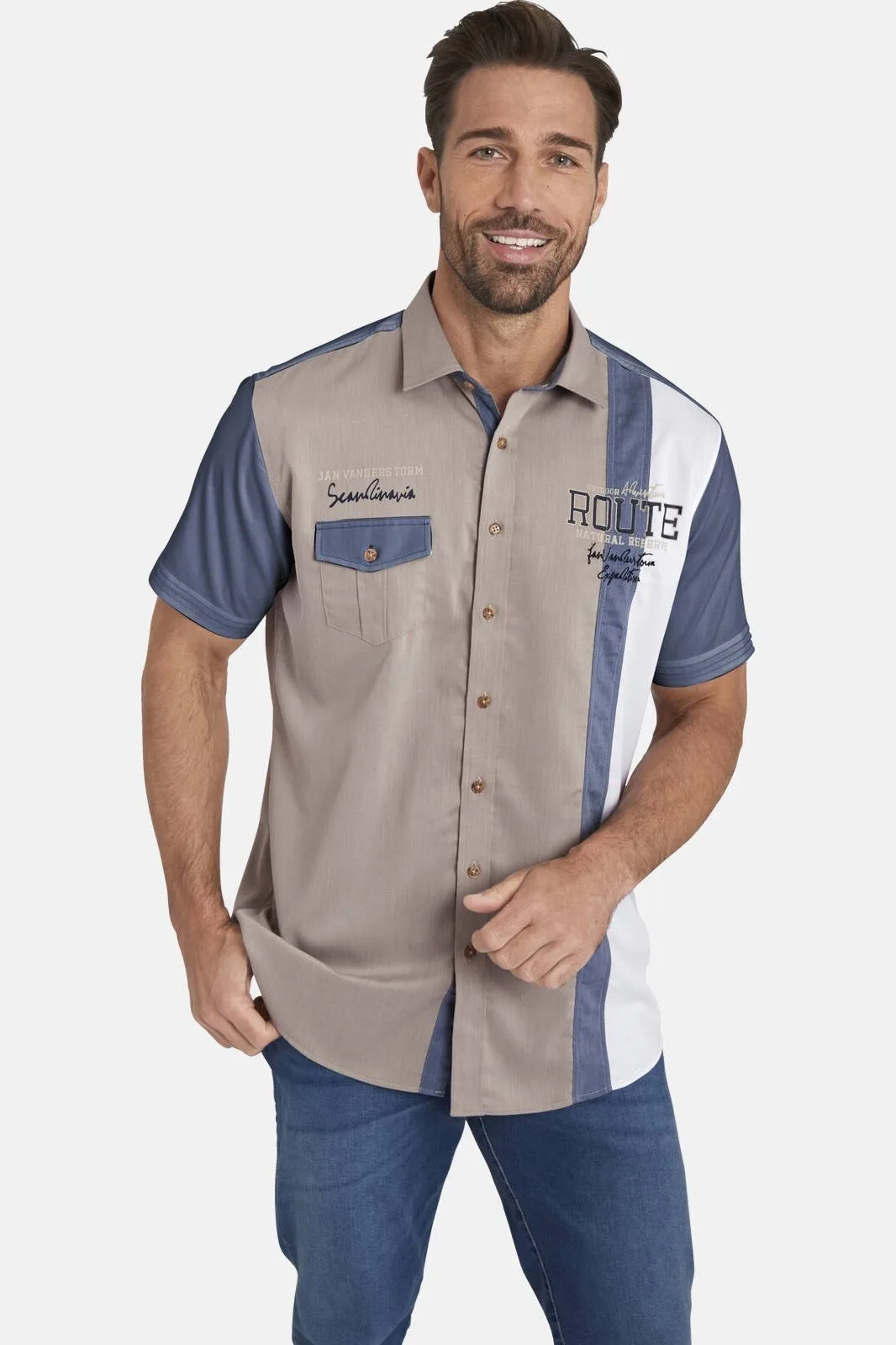 JAN VANDERSTORM is uw expert voor herenmode in grote maten. We kennen het uit de kunst: asymmetrie trekt altijd duidelijk meer aandacht en creëert spanning. Bij overhemd met korte mouwen BODVAR hebben wij dit ter harte genomen en de kleurvlakken afwisselend geplaatst. Links op de voorkant is een JV-motief over brede verticale strepen aangebracht, rechts op het voorpand bevindt zich boven de opgestikte borstzak met knoop een tekst en de zandkleurige korte mouwen zijn in dezelfde tint als de schouderpas. De kentkraag met marineblauwe binnenkant en de zandkleurige knopen zijn nog meer in het oog springende accenten. BODVAR staat even goed bij spijkerbroeken als bij de broeken met lage band van JAN VANDERSTORM. Ontdek het zelf! 100% katoen. Geschikt voor de wasmachine.