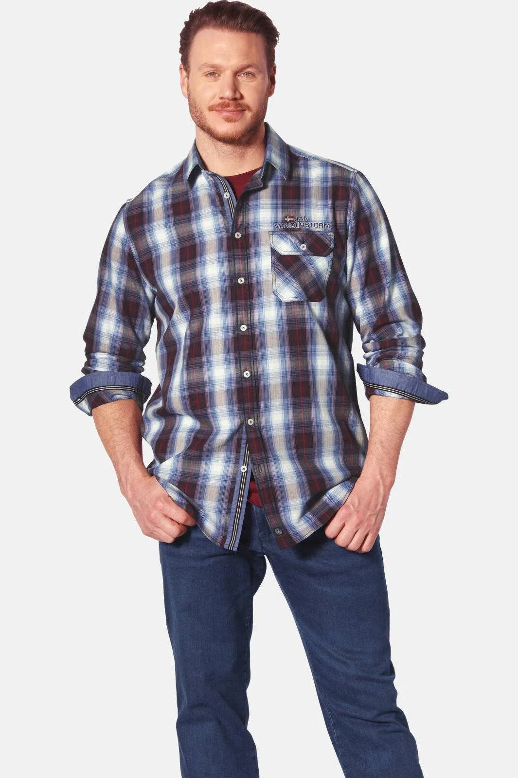 JAN VANDERSTORM is uw expert voor herenmode in grote maten. Klassiek, elegant en met een vleugje zeebries: zo overtuigt het overhemd KAITAR van JAN VANDERSTORM in volle glorie. Dit overhemd heeft een traditionele kentkraag, geraffineerde, contrasterende details op de manchetten en een stijlvol borduursel met maritieme flair. Aan de linkerkant zit een praktische borstzak met knoop, waarin u uw belangrijke spullen veilig kunt meenemen. Het decoratieve borduursel vlak boven de zak onderstreept de hoogwaardige uitstraling van het overhemd. Met het overhemd KAITAR hebt u het ideale maatje in huis voor een stijlvolle wandeling langs de kust. Materiaal: 100% katoen. Geschikt voor de wasmachine. Collectie +Fit: comfortabel model uit onze +Fit-collectie. Met ons speciale model +Comfort is dit bovenstuk langer aan de voorkant zodat het in de broek gedragen kan worden zonder dat het uit de broeksband glipt, ook bij een duidelijk buikje.