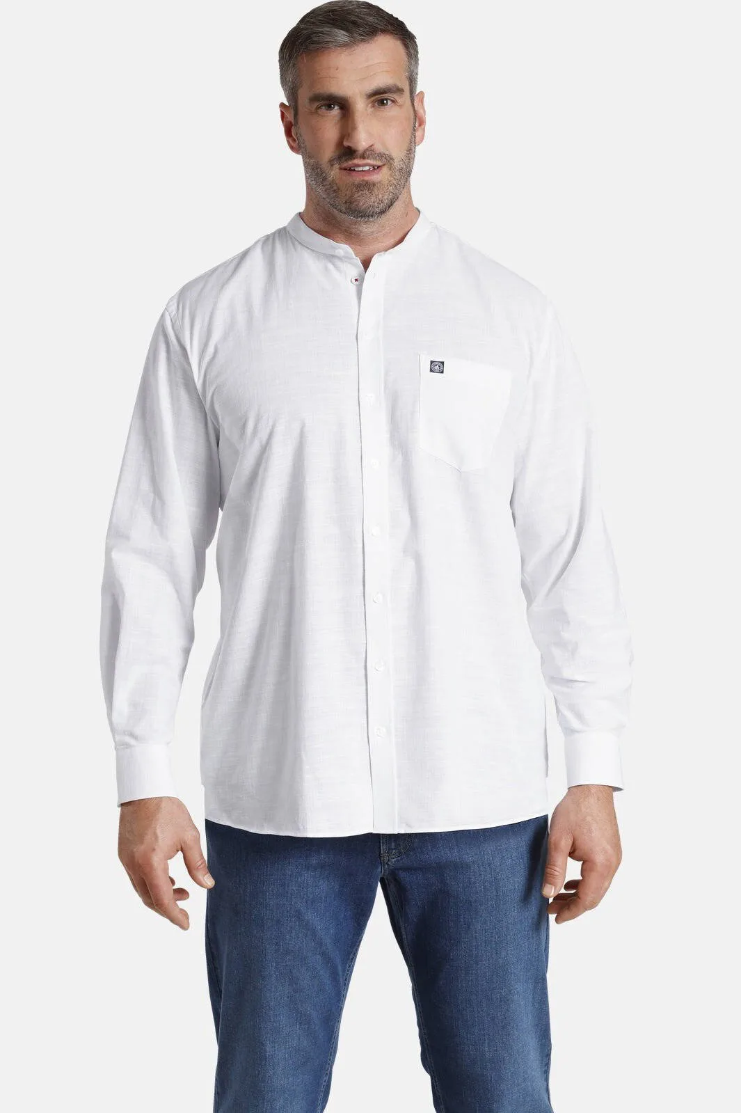 JAN VANDERSTORM is uw expert voor herenmode in grote maten. Bijzonder en minimalistisch: het overhemd KALLU overtuigt met een hoogwaardige linnenlook en een korte, opstaande kraag. Dit overhemd is de perfecte partner voor zoele zomeravonden. Het is luchtig en licht. De lange mouwen met mouwsplitten en knoop kunnen worden omgeslagen. Er zijn slechts twee gekleurde accenten: manchetten met een knoopsgat in contrastkleur en de tweede knoop van de knoopsluiting, die vastgenaaid is met contrasterend garen. Een opgestikte borstzak en het comfortabele model met enigszins afgeronde zoom maken het overhemd compleet. 100% katoen. Geschikt voor de wasmachine.