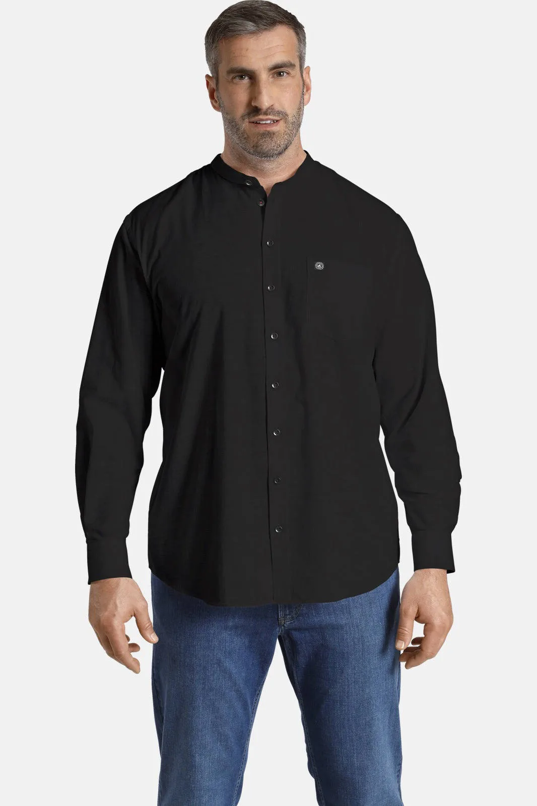 JAN VANDERSTORM is uw expert voor herenmode in grote maten. Bijzonder en minimalistisch: het overhemd KALLU overtuigt met een hoogwaardige linnenlook en een korte, opstaande kraag. Dit overhemd is de perfecte partner voor zoele zomeravonden. Het is luchtig en licht. De lange mouwen met mouwsplitten en knoop kunnen worden omgeslagen. Er zijn slechts twee gekleurde accenten: manchetten met een knoopsgat in contrastkleur en de tweede knoop van de knoopsluiting, die vastgenaaid is met contrasterend garen. Een opgestikte borstzak en het comfortabele model met enigszins afgeronde zoom maken het overhemd compleet. 100% katoen. Geschikt voor de wasmachine.