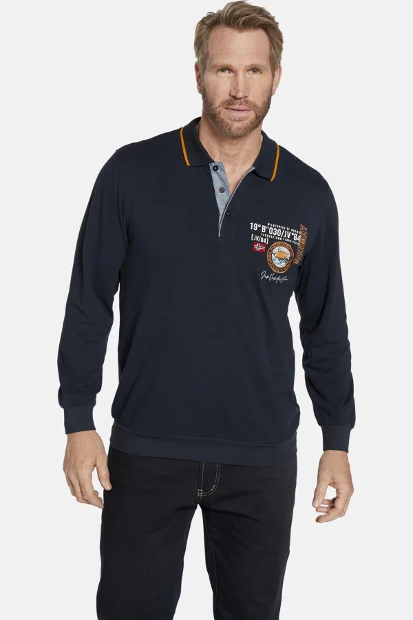 JAN VANDERSTORM is uw expert voor herenmode in grote maten.Klassieker kan nauwelijks – en toch is het shirt ook vlot: het poloshirt met lange mouwen LOKI heeft alle gewenste eigenschappen. Te beginnen bij het piqué van zacht katoen, tot vormgevende boorden aan de mouwen en zoom, tot de vlakgebreide polokraag. Daar komen nog allerlei stijlvolle extra’s bij: de knoopsluiting is afgewerkt met chambray, de stof die vaak wordt gebruikt voor herenoverhemden, en ook heeft het shirt een prachtige print met geborduurde elementen. Die is niet alleen een blikvanger – met motieven waarvan men bijna de Noorse Zee kan horen ruisen, doet hij ook de gedachten zweven naar verre oorden. Comfort fit. 100% katoen. Geschikt voor de wasmachine.