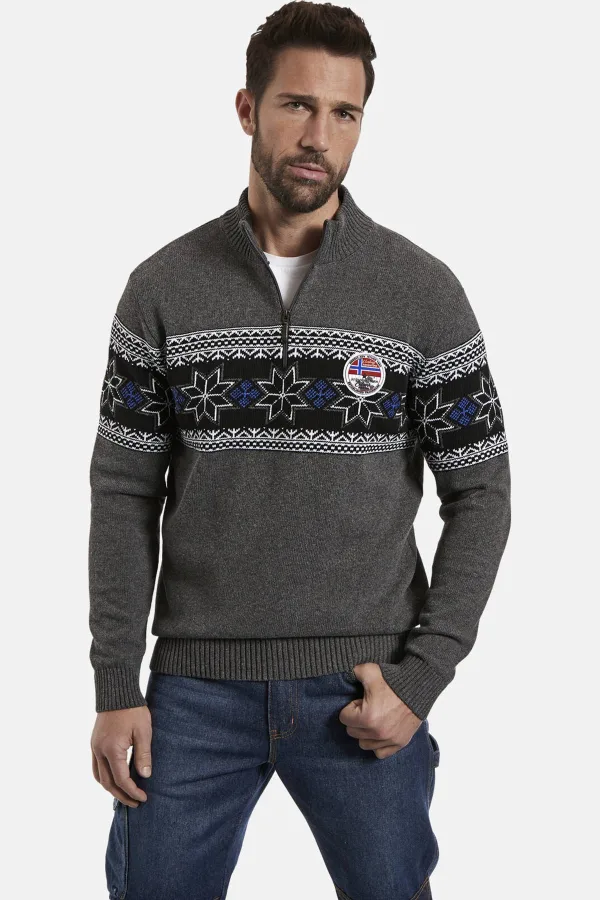 JAN VANDERSTORM is uw expert voor herenmode in grote maten.Op zoek naar een spectaculaire bestemming voor een ontspannen bergwandeling? Dan beveelt JAN VANDERSTORM Holmenkollen bij Oslo aan – en ook de bijbehorende trui EERU. Ten eerste: Holmenkollen is gemakkelijk te beklimmen, want hij is slechts 371 meter hoog. Ten tweede: in Holmenkollen staat ook de oudste skischans ter wereld en een bezienswaardig biatlon- en langlaufstadion. En ten derde: bij de trui EERU bewijst het ingebreide Noorse patroon aan de voorkant en boven aan de mouwen dat u een echte Scandinavië-fan bent. EERU is goed bestand tegen de wind met zijn geribde schipperskraag met ritssluiting en geribde zoom en mouwboorden. En met de vlag op de patch op de borst maakt EERU aan iedereen duidelijk waar uw hart voor klopt: voor Noorwegen en voor JAN VANDERSTORM. 50% katoen, 50% polyacryl. Geschikt voor de wasmachine