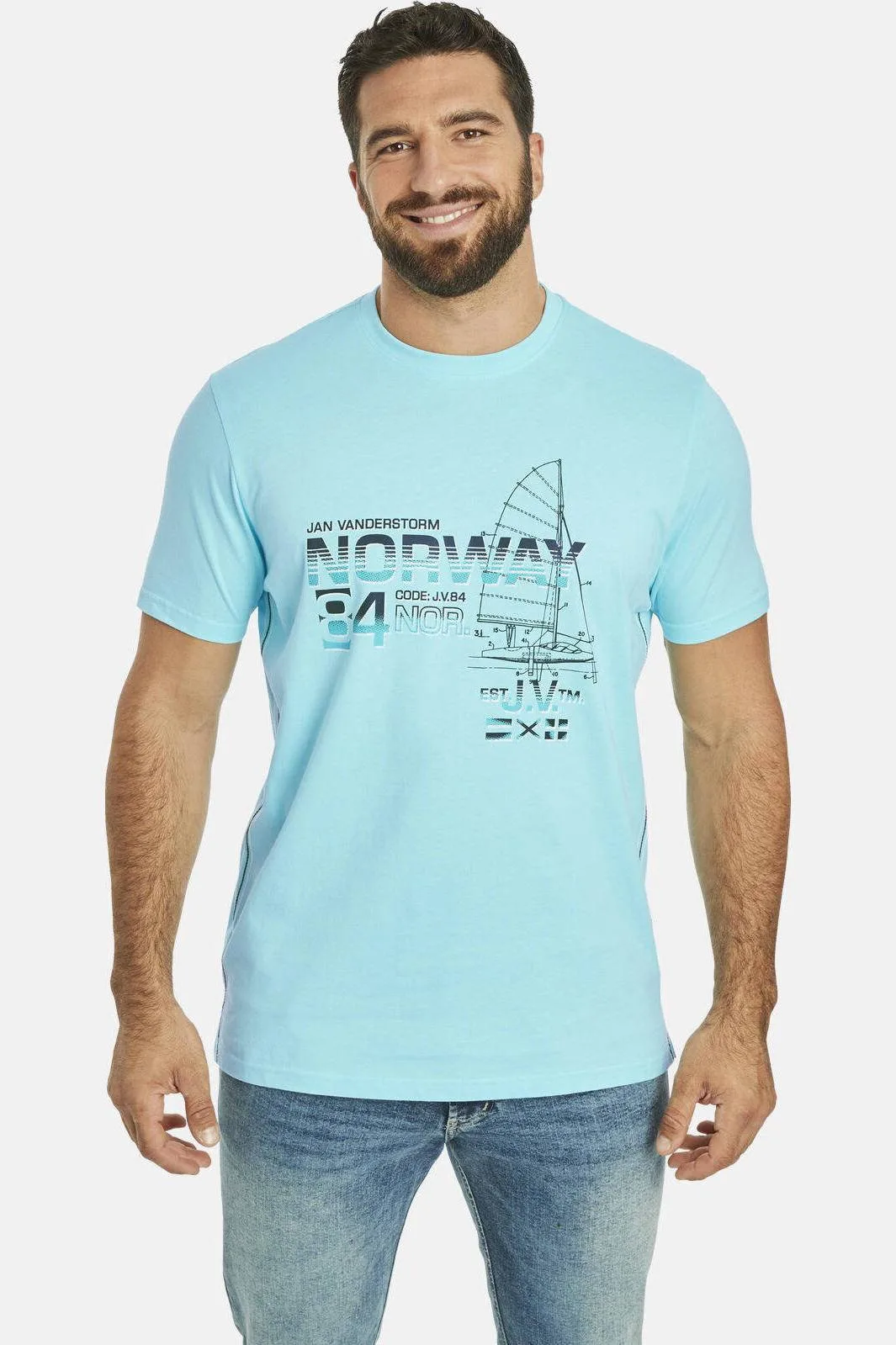 JAN VANDERSTORM is uw expert voor herenmode in grote maten. Het vakantiegevoel ook ervaren in het dagelijks leven? T-shirt EILI van JAN VANDERSTORM maakt het mogelijk! EILI valt op door de prachtige print op de voorkant met de tekst 'Noorwegen', de afbeelding van een zeilboot en verschillende maritieme elementen. De naden zijn voor een casual touch contrastkleurig en onder de ronde hals bevindt zich een karakteristieke print. Aan elke kant zitten drie fijne siernaden die u langer doen lijken. U kunt optimaal van de zomer genieten in T-shirt EILI. Elke dag in EILI voelt namelijk als een zonnige vakantie aan zee. 100% katoen. Geschikt voor de wasmachine. +FIT-COLLECTIE: comfortabel model uit onze +Fit-collectie. Met ons speciale model +Comfort is dit bovenstuk langer aan de voorkant zodat het in de broek gedragen kan worden zonder dat het uit de broeksband glipt, ook bij een duidelijk buikje.