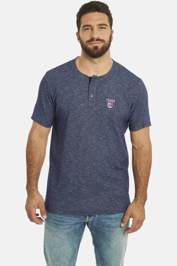 JAN VANDERSTORM is uw expert voor herenmode in grote maten. T-shirt BENKT van JAN VANDERSTORM overtuigt vooral door het mooi gemêleerde oppervlak met fijn geribde structuur. De wijde, ronde hals heeft drie knoopjes met metaallook en ziet er supercasual uit. Als detail is er een patch met een golf op de borst aangebracht, wat het geheel een Scandinavische touch geeft. Hierdoor is T-shirt BENKT ideaal voor de vrije tijd. 100% katoen. Geschikt voor de wasmachine