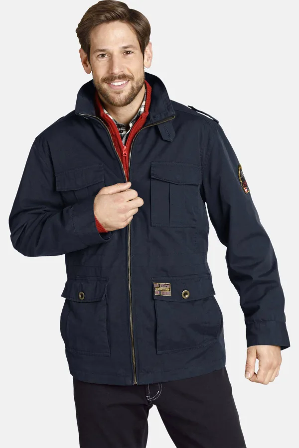 JAN VANDERSTORM is uw expert voor herenmode in grote maten.BROR – het robuuste fieldjacket voor echte kerels. Losjes vallend model, te tailleren dankzij tunnelkoord. Met ritssluiting, opstaande kraag met sierpat en epauletten. Vier opgestikte klepzakken met drukknoop. Patch op de linkerbovenarm. Drie binnenzakken. Modieuze used look met waseffecten. Bovenmateriaal: 100% katoen. Voering: 65% polyester, 35% katoen. Voering van de mouwen: 100% polyester. Geschikt voor de wasmachine.