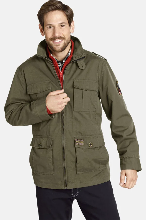 JAN VANDERSTORM is uw expert voor herenmode in grote maten.BROR - het robuuste fieldjacket voor echte kerels. Losjes vallend model, te tailleren dankzij tunnelkoord. Met ritssluiting, opstaande kraag met sierpat en epauletten. Vier opgestikte klepzakken met drukknoop. Patch op de linkerbovenarm. Drie binnenzakken. Modieuze used look met waseffecten. Bovenmateriaal: 100% katoen. Voering: 65% polyester, 35% katoen. Voering van de mouwen: 100% polyester. Geschikt voor de wasmachine.