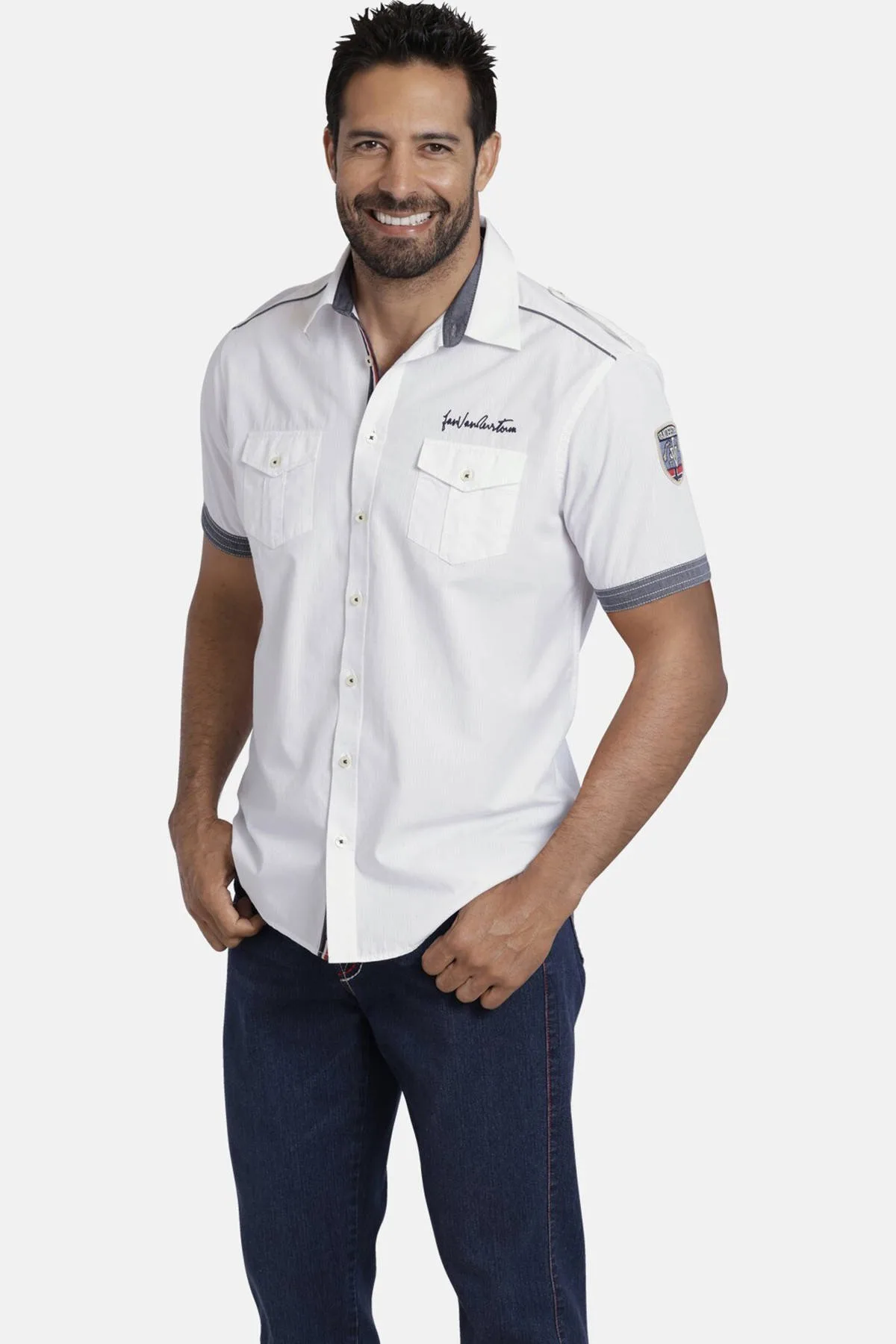 JAN VANDERSTORM is uw expert voor herenmode in grote maten. Witte overhemden behoren tot de meest verkochte overhemden – en overhemd SKIRNIR met korte mouwen maakt nog eens duidelijk waarom dat zo is. De opvallende details zoals de epauletten met contrasterende naden en de borstzakken met klep en knoop zorgen voor een bijzonder fraaie, maritieme look. Met blauwe details bij de mouwzomen, aan de binnenkant van de knoopsluiting en het lusje aan de achterkant. Extraatje: reserveknopen op een geïntegreerd plaatje. JAN VANDERSTORM laat met SKIRNIR zien hoe een overhemd met maritieme touch eruit hoort te zien! 100% katoen. Geschikt voor de wasmachine.