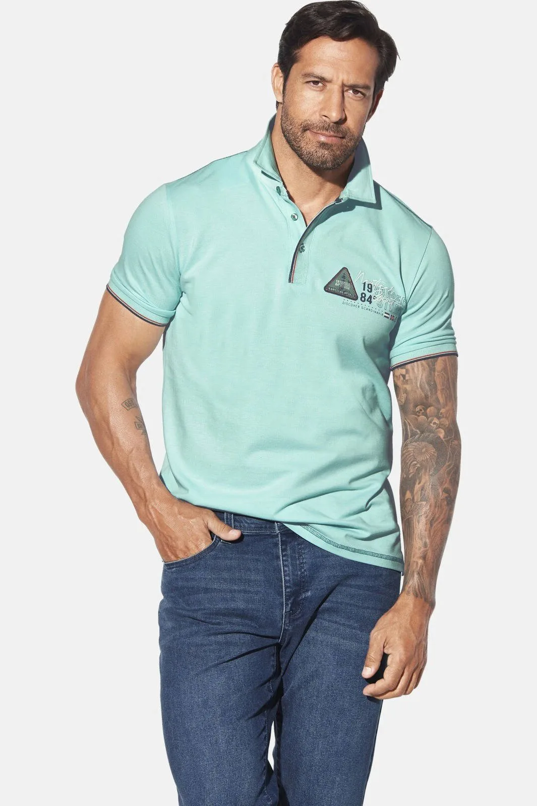JAN VANDERSTORM is uw expert voor herenmode in grote maten. Met de KNUTLAND polo van JAN VANDERSTORM voeg je een stoer stukje Scandinavische stijl toe aan je garderobe. De sportieve polokraag en knoopsluiting met opvallende contrasterende strepen geven dit shirt in grote maten een sterke look. Expressieve prints op de borst en onder de kraag zorgen voor echte blikvangers. Zijsplitten en elastische manchetten met gekleurde accenten garanderen een supercomfortabele pasvorm. KNUTLAND is het ideale overhemd voor mannen die duidelijk voor de dag willen komen - stijlvol, comfortabel en zelfverzekerd. Materiaal 100% katoen. Machinewasbaar. +FIT COLLECTIE: Comfortabele stijl uit onze +Fit collectie. Met onze speciale +Comfort snit is deze top langer aan de voorkant en kan daarom in een broek worden gedragen zonder uit te zakken, zelfs met een uitgesproken taille.