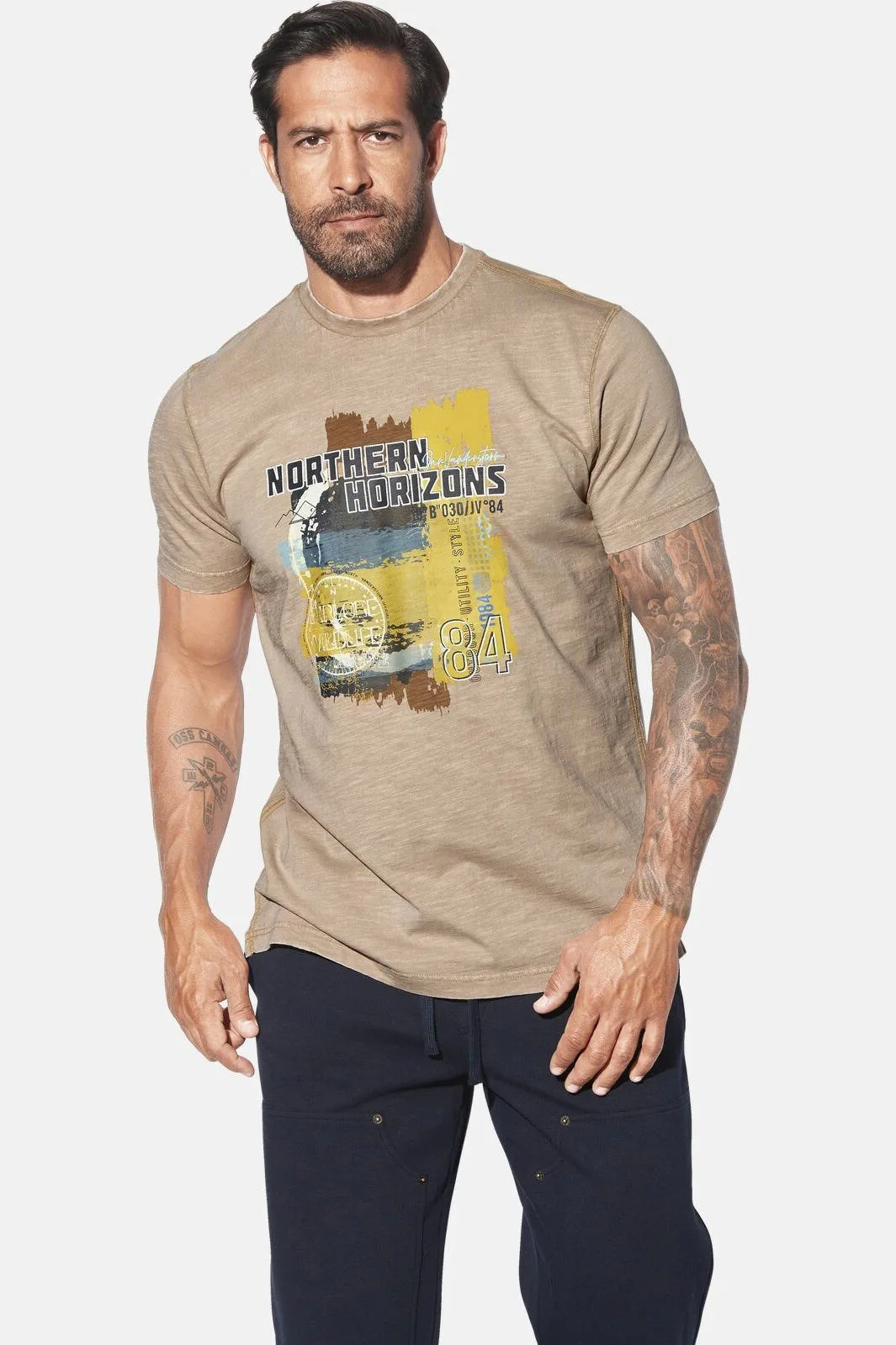 JAN VANDERSTORM is uw expert voor herenmode in grote maten. Het NORHEIM T-shirt van JAN VANDERSTORM brengt een flinke dosis nonchalance in je dagelijkse leven. Met zijn klassieke ronde hals, fijne textuur en lichte wassing heeft het shirt in grote maten een echte stoere look. De gedurfde print aan de voorkant maakt een stijlvol statement, terwijl de zijsplitten sterke mannen extra bewegingsvrijheid geven. Precies iets voor mannen die het graag comfortabel hebben – en er tegelijkertijd goed uit willen zien! Materiaal 100% katoen. Machinewasbaar.