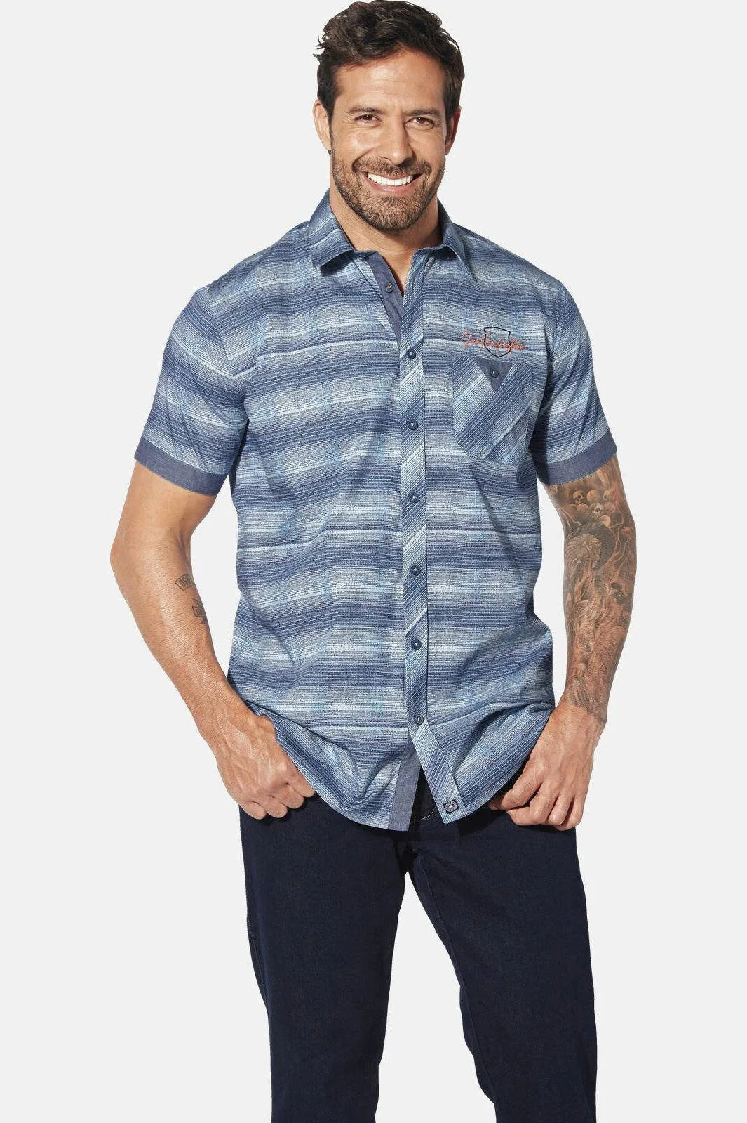 JAN VANDERSTORM is uw expert voor herenmode in grote maten. Het MERTRICH overhemd met korte mouwen van JAN VANDERSTORM is een echte highlight voor je garderobe. Dit casual en expressieve overhemd met streepjesprint is perfect voor echte kerels die van patroonprints houden. Met zijn klassieke Kent-kraag en geraffineerde details op de borst - zoals een zakje met knoopsluiting en contrasterend borduursel - zorgt het voor een pittige uitstraling. De mouwboorden zijn vakkundig contrasterend van kleur en frissen het ontwerp echt op. Het MERTRICH overhemd met korte mouwen is een luchtige keuze in trendy kleuren.