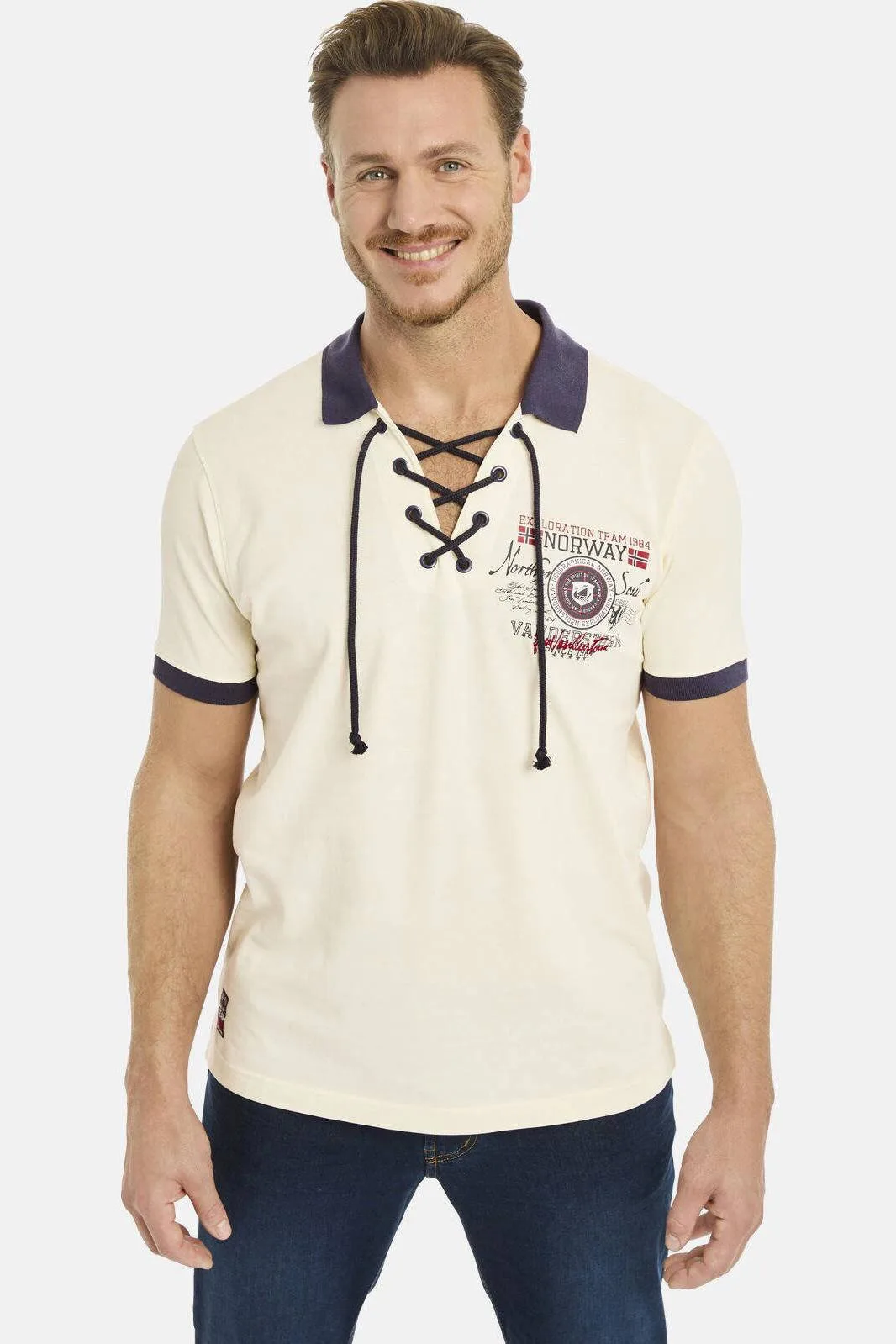 JAN VANDERSTORM is uw expert voor herenmode in grote maten. Wanneer u de 'Fjord Spirit' zelfs thuis in uw eigen tuin niet los kunt laten, ligt dat waarschijnlijk aan de set van twee poloshirts ELJAR en hun maritieme details. Ja, ook bij het grasmaaien en het snoeien van de heg kunt u blijven dromen over het Hoge Noorden. De set ELJAR bevat twee poloshirts met contrasterende ribboorden aan de kraag en mouwen, met een koordje aan de hals en met Scandinavisch geïnspireerde borduursels en prints op de borst. De zijsplitten in de zoom geven u de gewenste bewegingsvrijheid – tussen noord en zuid, oost en west, land en zee. 100% katoenen piqué. Geschikt voor de wasmachine.