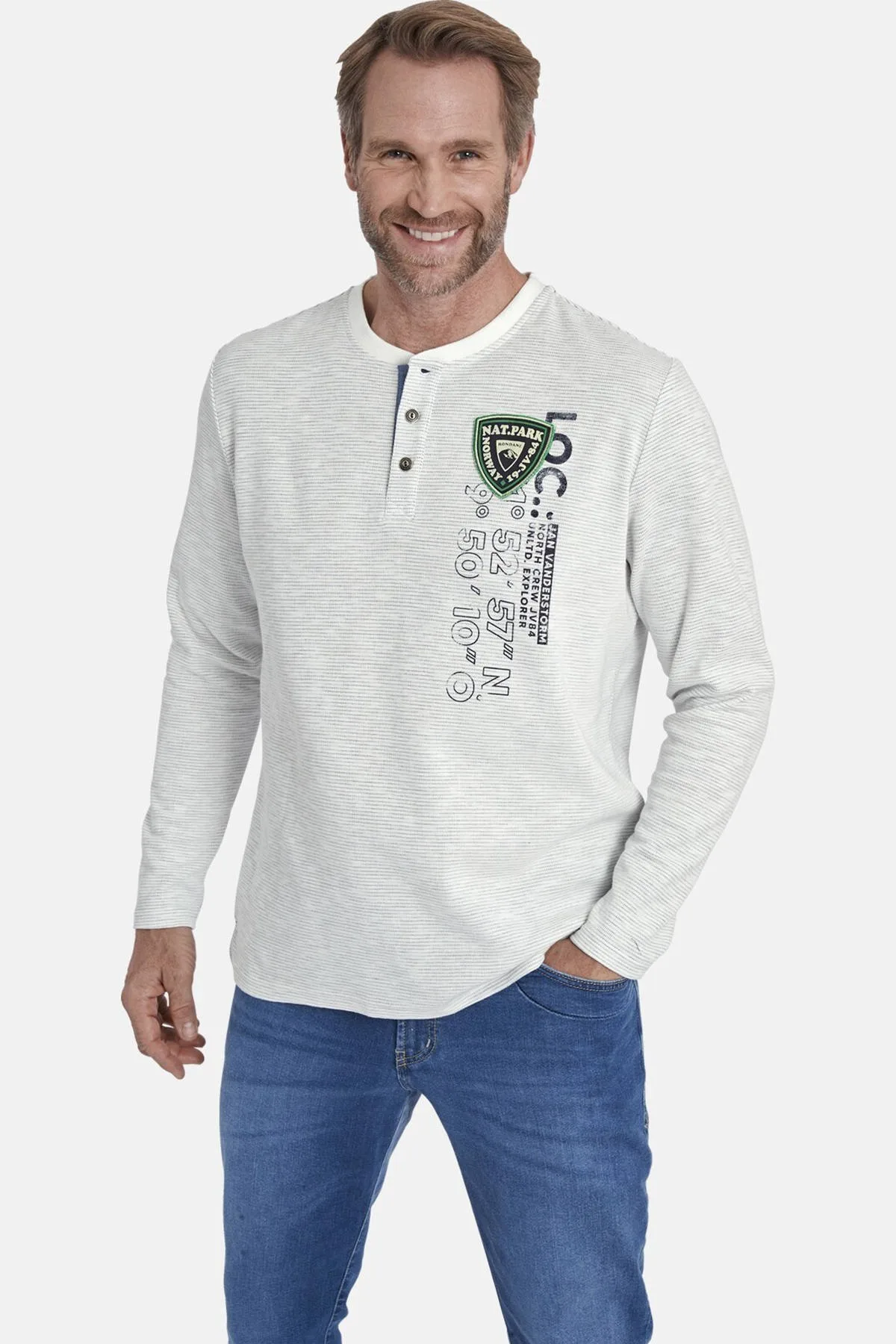 JAN VANDERSTORM is uw expert voor herenmode in grote maten. De patch op het sweatshirt REGINALD stelt 'Rondane' centraal. Dit nationale park in de buurt van de Noorse stad Lillehammer is sowieso een reis waard, want daar bevinden zich tien bergtoppen boven de 2000 meter en tal van adembenemende watervallen. Met zijn smalle boord en contrasten op de serafinohals met knoopsluiting en met zijn zijsplitten in de zoom past REGINALD uitstekend in dit landschap. Het sweatshirt is trouwens gemaakt van fijn gestreept materiaal. 100% katoen. Geschikt voor de wasmachine.