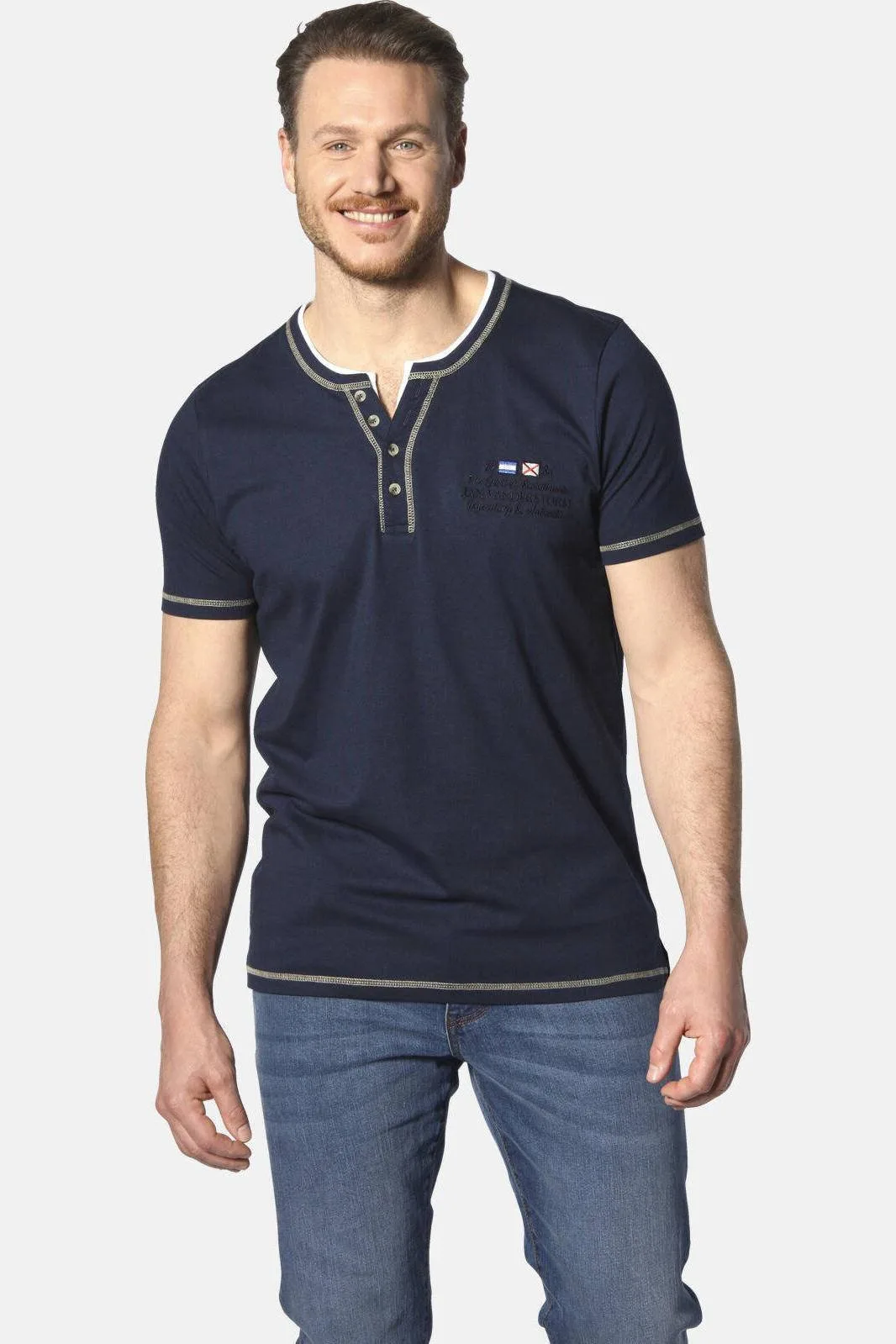 JAN VANDERSTORM is uw expert voor herenmode in grote maten. Altijd een goede keuze: het T-shirt HAFTOR van JAN VANDERSTORM combineert klassieke nonchalance met moderne flair. Dit comfortabele shirt overtuigt door een vlotte serafinohals met vier knopen, die het shirt een echte blikvanger maakt. Voor Scandinavische flair zorgt het borduursel met kleine vlaggen links op de borst, dat maritieme charme uitstraalt. Een prachtig contrast op de hals is een speelse, dynamische finishing touch. Ook de naden van het shirt zijn stijlvol uitgevoerd in een contrastkleur. Met het T-shirt HAFTOR kunt u erop vertrouwen dat u er te allen tijde cool uitziet. Materiaal: 100% katoen. Geschikt voor de wasmachine.
