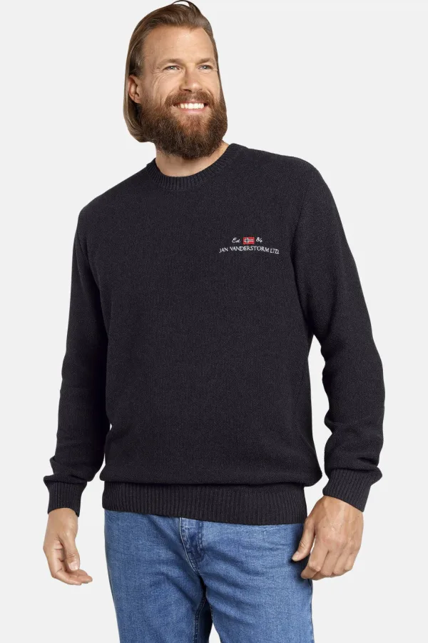 JAN VANDERSTORM is uw expert voor herenmode in grote maten. De trui ALBREKT is een klassieke basic in een nieuw jasje. Clean design met een gemêleerde look. Recht en comfortabel model, met ronde hals. Geborduurd label met vlag op borsthoogte links. Ribboorden aan de mouwen en langs de zoom. Van 50% katoen, 50% polyacryl. Geschikt voor de wasmachine..