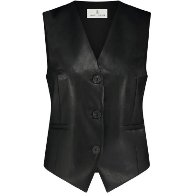Het Erik Vest (ML424126) van JANE LUSHKA is een gilet met V-hals en doorknoopsluiting. Deze leather look gilet is gevoerd, heeft dicht gestikte paspelzakken aan de voorzijde en een strikdetail van stof aan de achterzijde. Het gilet heeft een aangesloten pasvorm, valt op de heup en is uitgevoerd in de kleur Black.De stof is gemaakt van Viscose.