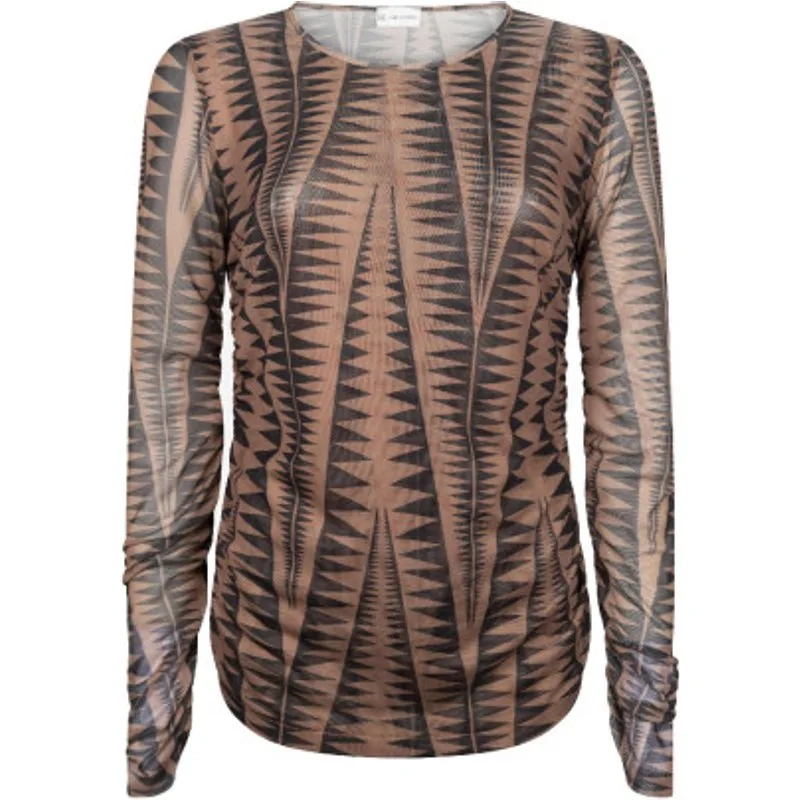De Gio Top Technical Jersey TBB623127A van JANE LUSHKA is een top met lange mouwen en een ronde hals. Het shirt is geribbeld bij de taille aan de zijkant en is uitgevoerd in een all-over print in de kleuren Brown. Het model is 1,79 cm en draagt maat S.